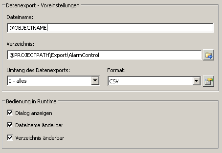 Die in den WinCC Controls angezeigten Runtimedaten können Sie über eine Tastenfunktion exportieren. Sie projektieren im Konfigurationsdialog die Bedienung des Datenexports in Runtime.